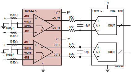 LT6604-10_Typical ApplicationTypical Application Circuit for LT6604CUFF-10 Dual Matched 10MHz Lowpass Filter |