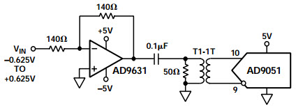 AD9051_Typical ApplicationTypical Application for AD9051, 10-Bit, 60-Msps A/D Converter Using Transformer Coupling |