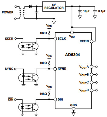 AD5304_Typical ApplicationTypical Application for AD5304 8-Bit DAC in an Opto-Isolated Interface |